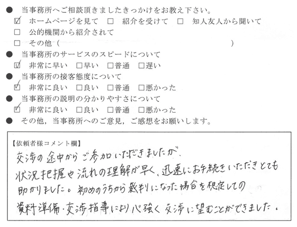 - この度は,本当にありがとうございました。労働審判というものは全く初めてでして,どのように対応したら良いか全く分かりませんでした。また,吉村弁護士に相談する前に,他に2つの法律事務所に相談したが,「慣れていない」,「期日が迫っていて無理」などとの理由で断られてしまって,本当に途方に暮れていました。労働審判期日が1週間前に迫り,もう何もかも投げ出してしまい,会社も畳んでしまおうかとも考えていましたところ,ホームページで労働問題にお強いとのことで,藁にもすがる気持ちで,吉村先生に相談しました。吉村先生は,丁寧に当社の事情を聴いて下さり,具体的な対応策を明確にお示し頂きました。吉村先生以外に頼る弁護士も居ませんでしたので,何とかお願い致しました。吉村先生は,直ちに対応を取って頂き,当社の事情を踏まえた上で,説得力のある対応をして頂きました。その結果,従業員の請求を85%も削減する金額による調停で終わらすことが出来ました。期日が切迫しているにも関わらず,このような結果を得られて大変満足しています。今後も継続的に相談をお願いします。